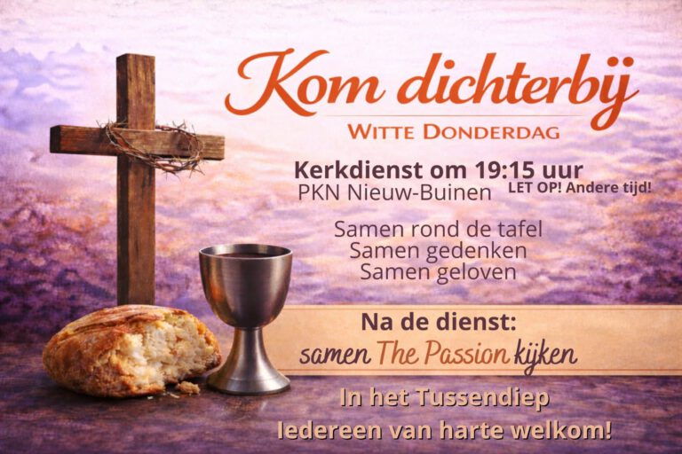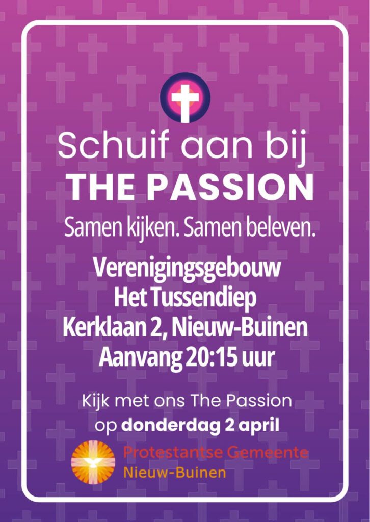 Na deze dienst is er de gelegenheid om aan te schuiven om samen met elkaar ‘The Passion’ te kijken en te beleven in ‘Het Tussendiep’ vanaf 20:15